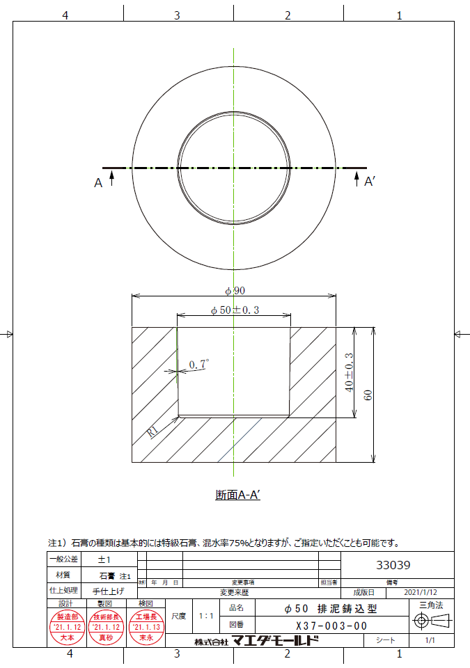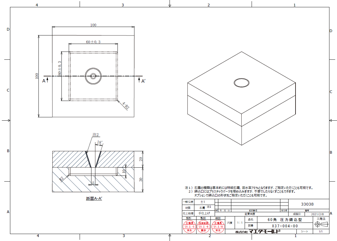 実際に原料を流し込んで、着肉状態や型離れなどをテストしていただくための有償サンプルです。排泥鋳込型と圧力鋳込型(自然圧用)の2種類をご用意しております。